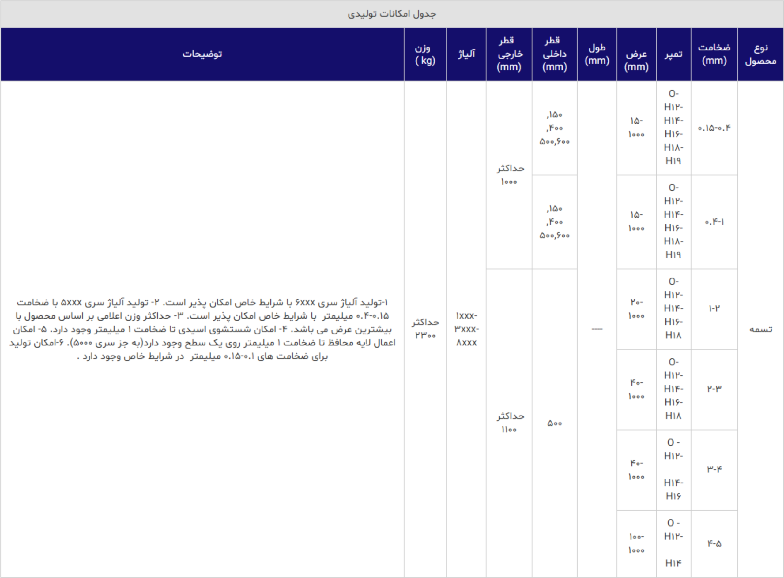 | تسمه | 0.15-0.4 | O-H12-H14-H16-H18-H19 | 15-1000 | ---- | 150, 400, 500,600 | حداکثر 1000 | 1xxx-3xxx-8xxx | حداکثر 2300 | 1-تولید آلیاژ سری 6xxx با شرایط خاص امکان پذیر است. 2- تولید آلیاژ سری 5xxx با ضخامت 0.15-0.4 میلیمتر با شرایط خاص امکان پذیر است. 3- حداکثر وزن اعلامی بر اساس محصول با بیشترین عرض می باشد. 4- امکان شستشوی اسیدی تا ضخامت 1 میلیمتر وجود دارد. 5- امکان اعمال لایه محافظ تا ضخامت 1 میلیمتر روی یک سطح وجود دارد(به جز سری 5000). 6-امکان تولید برای ضخامت های 0.1-0.15 میلیمتر در شرایط خاص وجود دارد . |