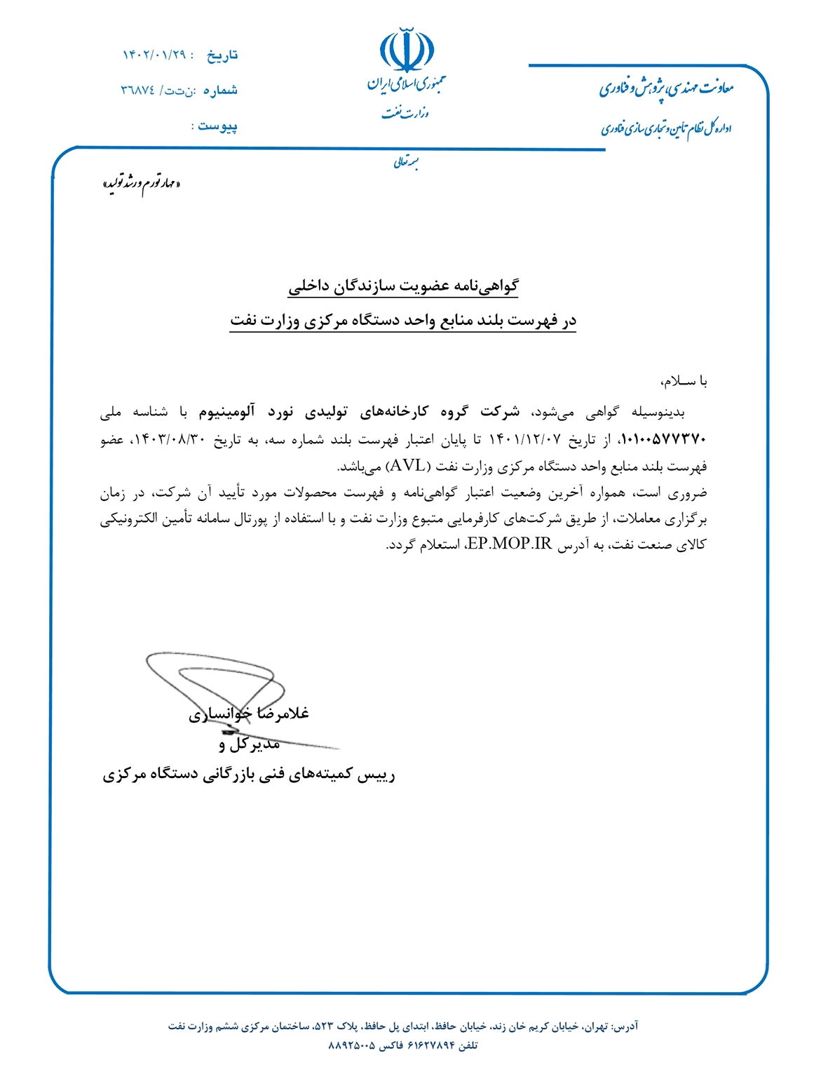 گواهی نامه عضویت سازندگان داخلی در فهرست بلند منابع واحد دستگاه مرکزی وزارت نفت