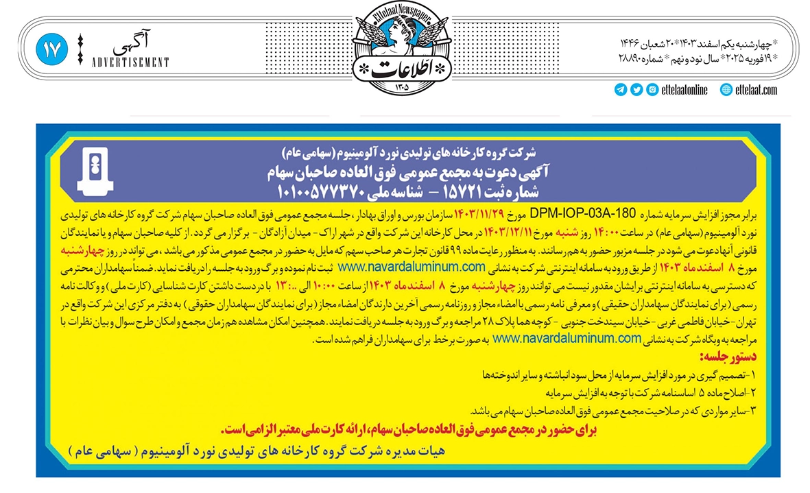 آگهی دعوت به مجمع عمومی فوق العاده صاحبان سهام