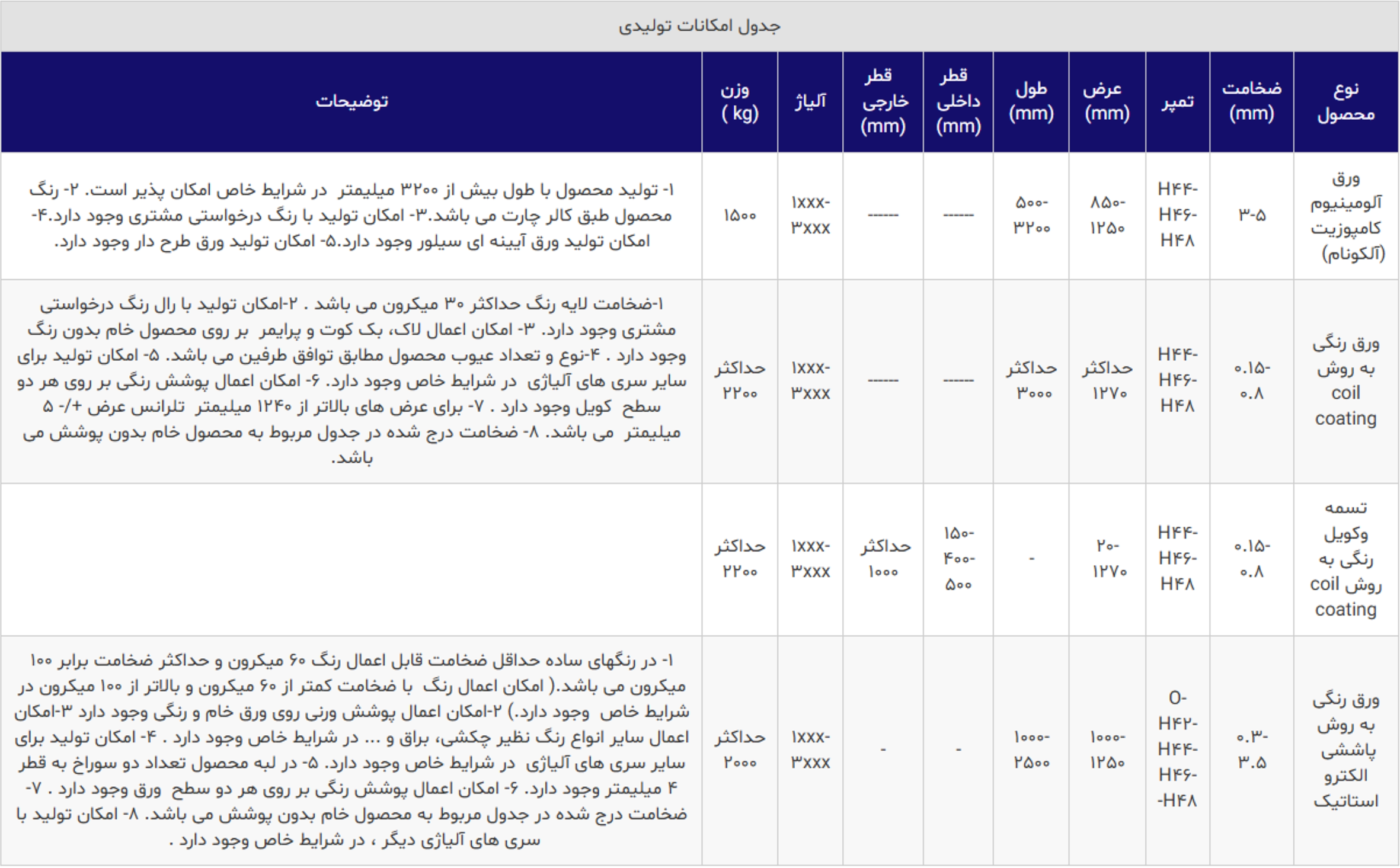 | تسمه وکویل رنگی به روش coil coating | 0.15-0.8 | H44-H46- H48 | 20-1270 | - | 150-400-500 | حداکثر 1000 | 1xxx-3xxx | حداکثر 2200 | |