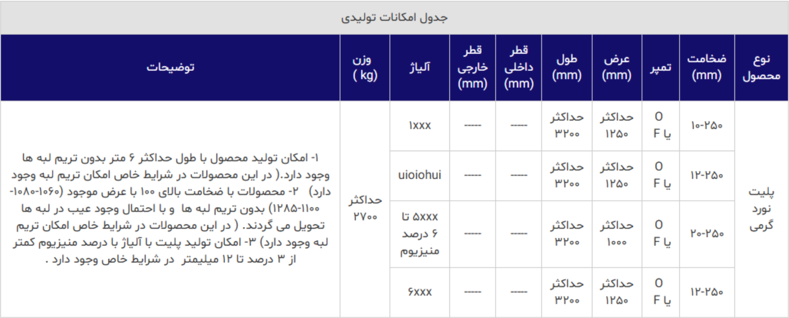 | پلیت نورد گرمی | 10-250 | O یا F | حداکثر 1250 | حداکثر 3200 | ----- | ----- | 1xxx | حداکثر 2700 | 1- امکان تولید محصول با طول حداکثر 6 متر بدون تریم لبه ها وجود دارد.( در این محصولات در شرایط خاص امکان تریم لبه وجود دارد) 2- محصولات با ضخامت بالای 100 با عرض موجود (1060-1080-1100-1285) بدون تریم لبه ها و با احتمال وجود عیب در لبه ها تحویل می گردند. ( در این محصولات در شرایط خاص امکان تریم لبه وجود دارد) 3- امکان تولید پلیت با آلیاژ با درصد منیزیوم کمتر از 3 درصد تا 12 میلیمتر در شرایط خاص وجود دارد . |