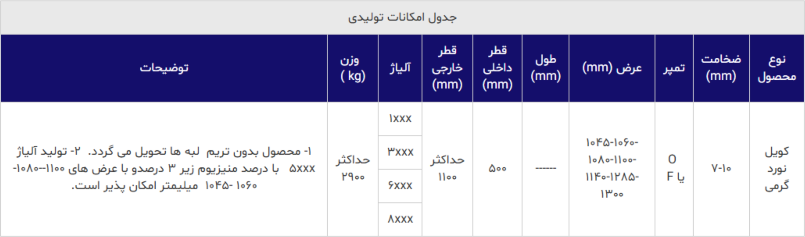 | کویل نورد گرمی | 7-10 | O یا F | 1045-1060-1080-1100-1140-1285-1300 | ------ | 500 | حداکثر 1100 | 1xxx | حداکثر 2900 | 1- محصول بدون تریم لبه ها تحویل می گردد. 2- تولید آلیاژ 5xxx با درصد منیزیوم زیر 3 درصدو با عرض های 1100--1080-1060 -1045 میلیمتر امکان پذیر است. |